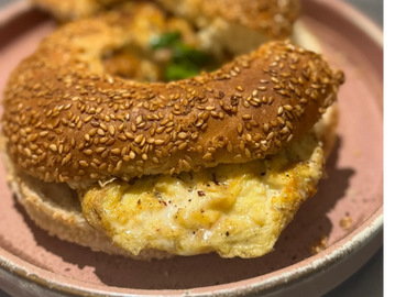 Scrambled eggs with cumin spiced ground beef topped with parsley. Served with a side of pita bread.